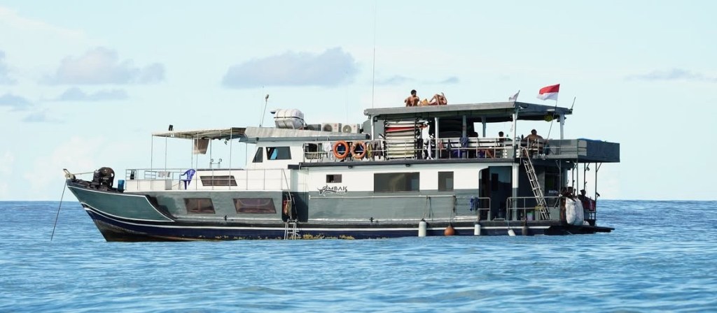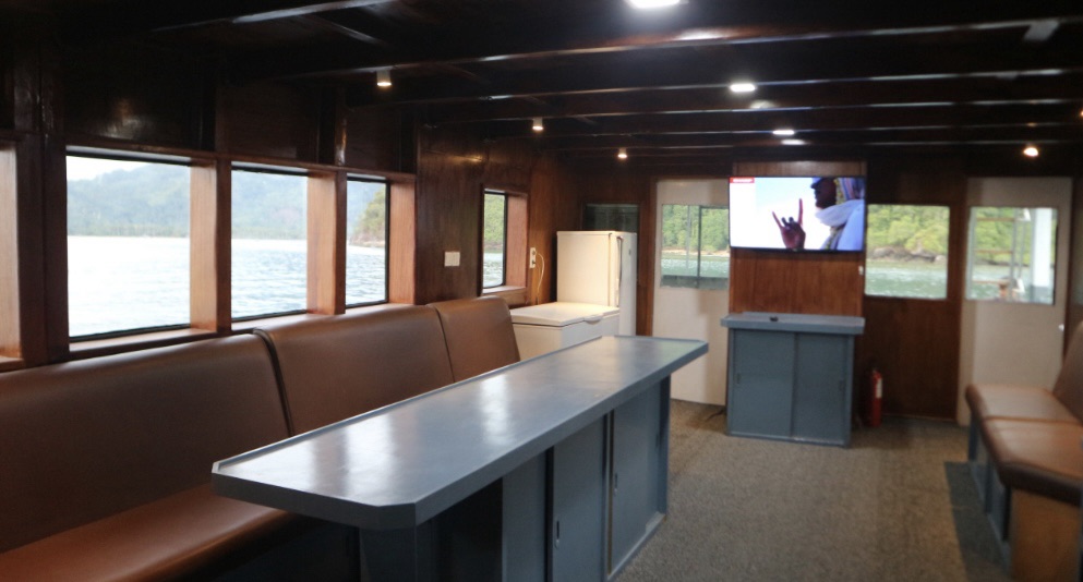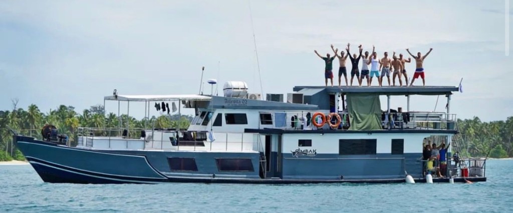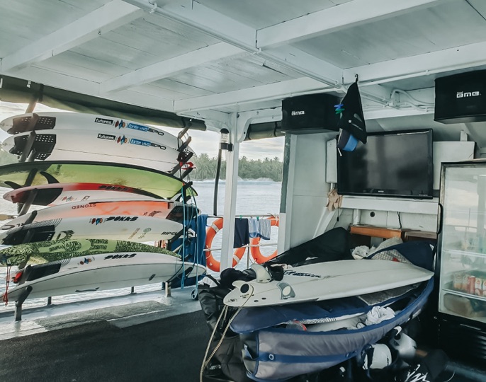 Our charter boat has everything needed for a comfortable trip: Air conditioning, cosy bunks, two bathrooms, a top deck with cover for relaxation, and ample space for your surfboards.